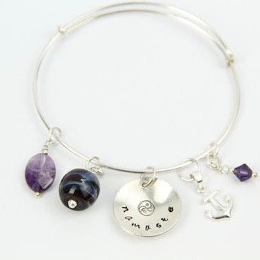 Sterling silver bangle with 22mm sterling disc stamped with word or saying of your choice. Handcrafted artisan glass bead. Customize completely-choose your bead color, stamped letter and sterling charm!