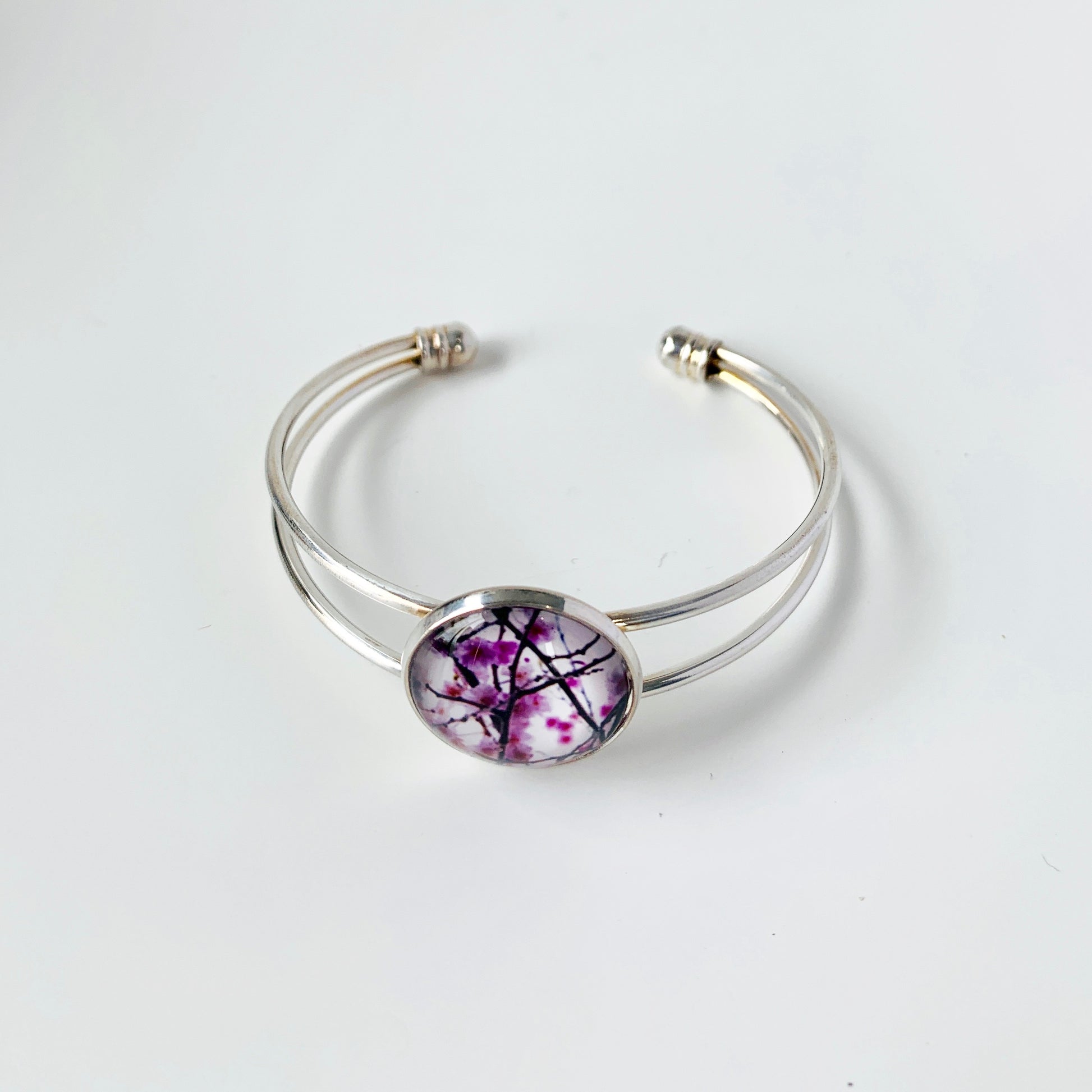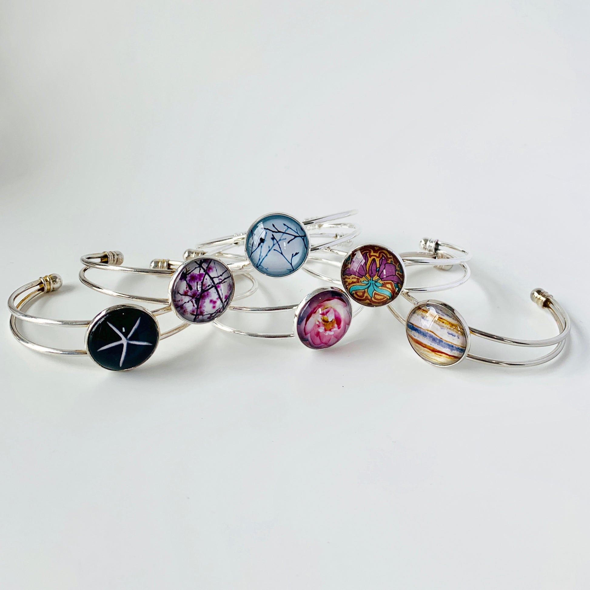 These original photographs are displayed under a beautiful dome magnifying glass. The metal is silver plated brass, and are light weight, durable and comfortable on the wrist. Stack them with your other favorite designs and pair them with the matching earrings or necklace! One size fits all. The bracelets are nickel and lead free. They are flexible and adjustable.