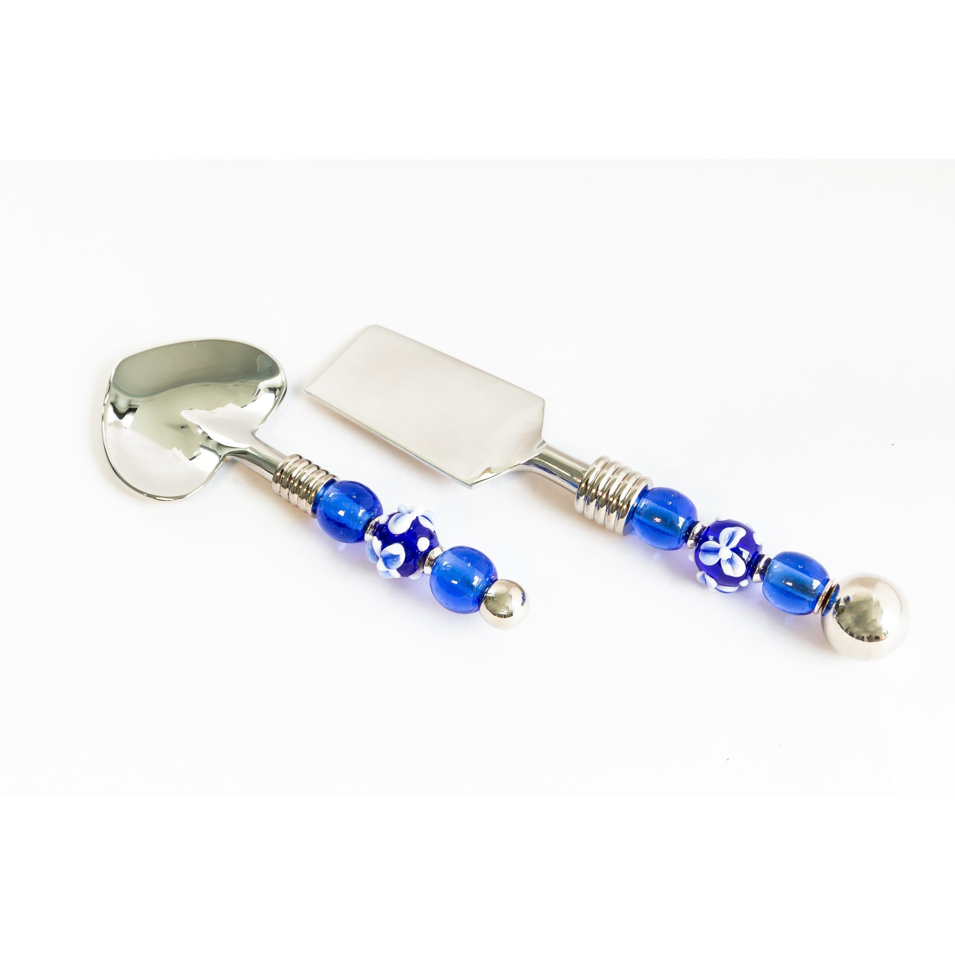 Spreader and spoon set with glass bead handles. Perfect for soft cheese, butter, or hummus. Handcrafted lampworked glass beads with transparent aqua, ivory and reactive silver glass.