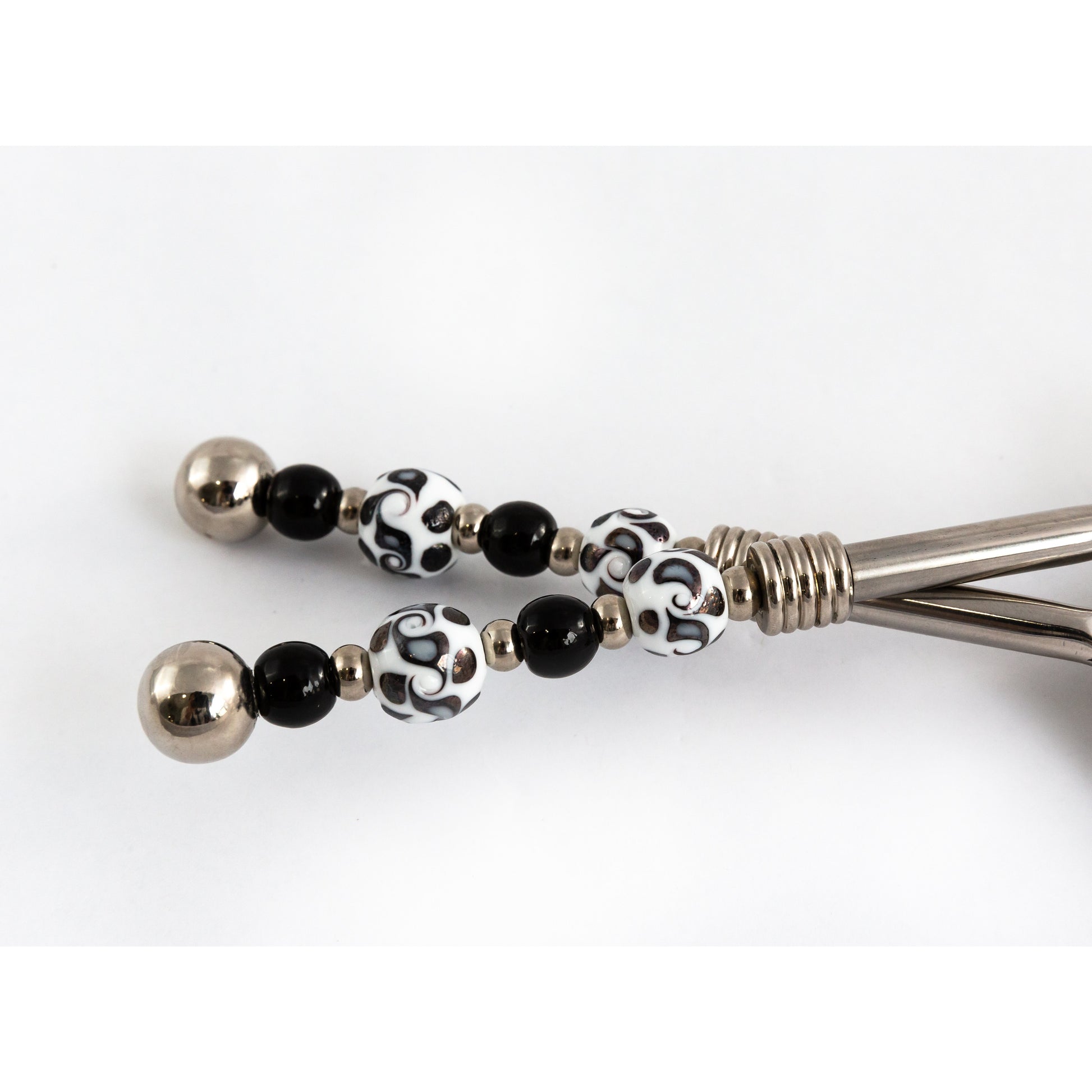 Cake/pie set with glass bead handles. Cut and serve your next cake or pie with pizzazz! Handcrafted lampwork glass beads with black and white waves