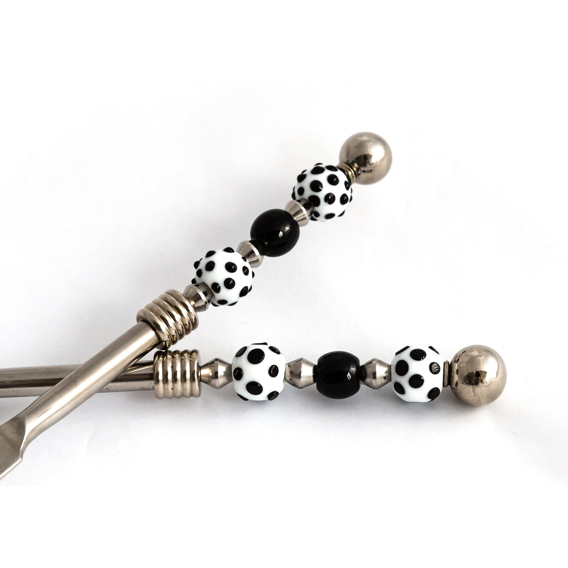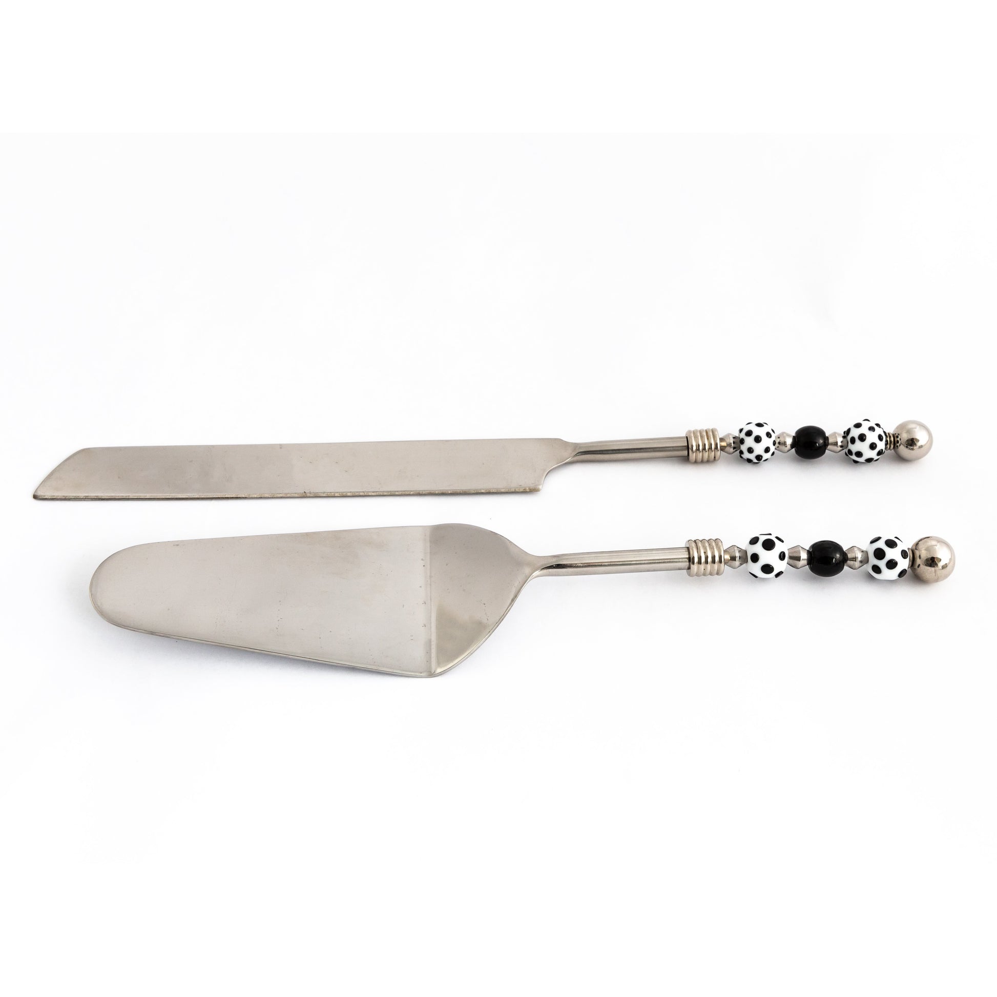 Cake/pie set with glass bead handles. Cut and serve your next cake or pie with pizzazz! Handcrafted lampwork glass beads with black and white dots.