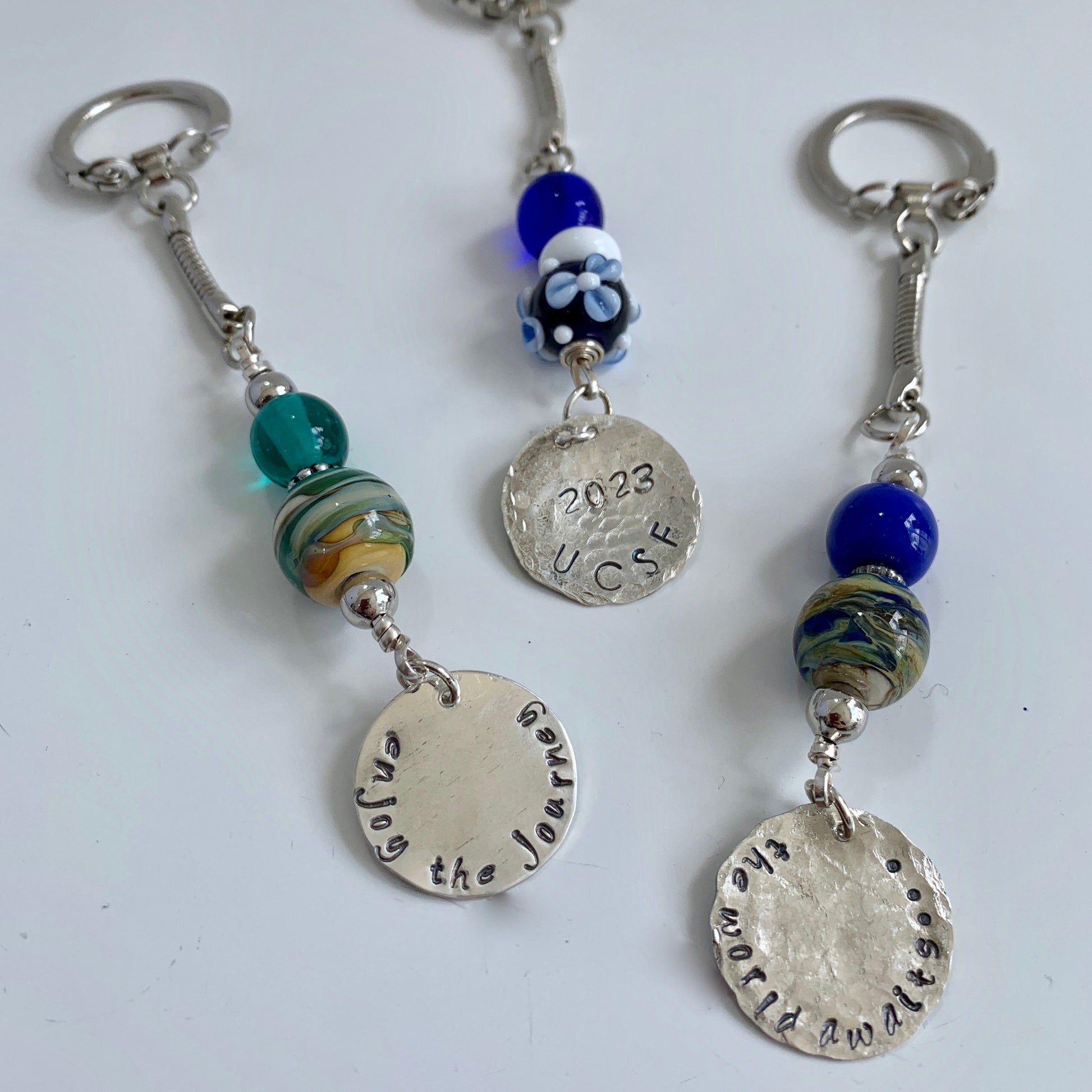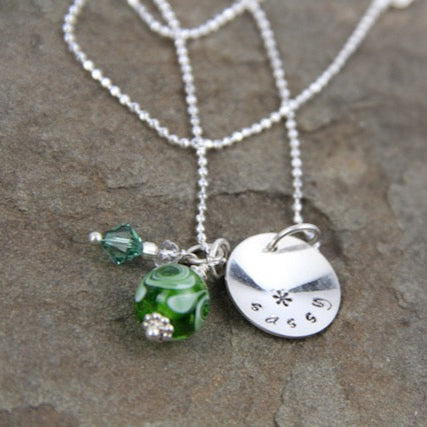 In this popular 2-hour workshop, you will create a one-of-a-kind hand-stamped sterling silver or gold-filled charm necklace, sterling bangle or a pair of keychains/handbag charms. You'll learn basic metal stamping techniques using a few simple tools. Once you’ve created your stamped components, you’ll incorporate handcrafted artisan glass beads and gemstones into beautiful finished jewelry. Makes the perfect gift or personalized memento.