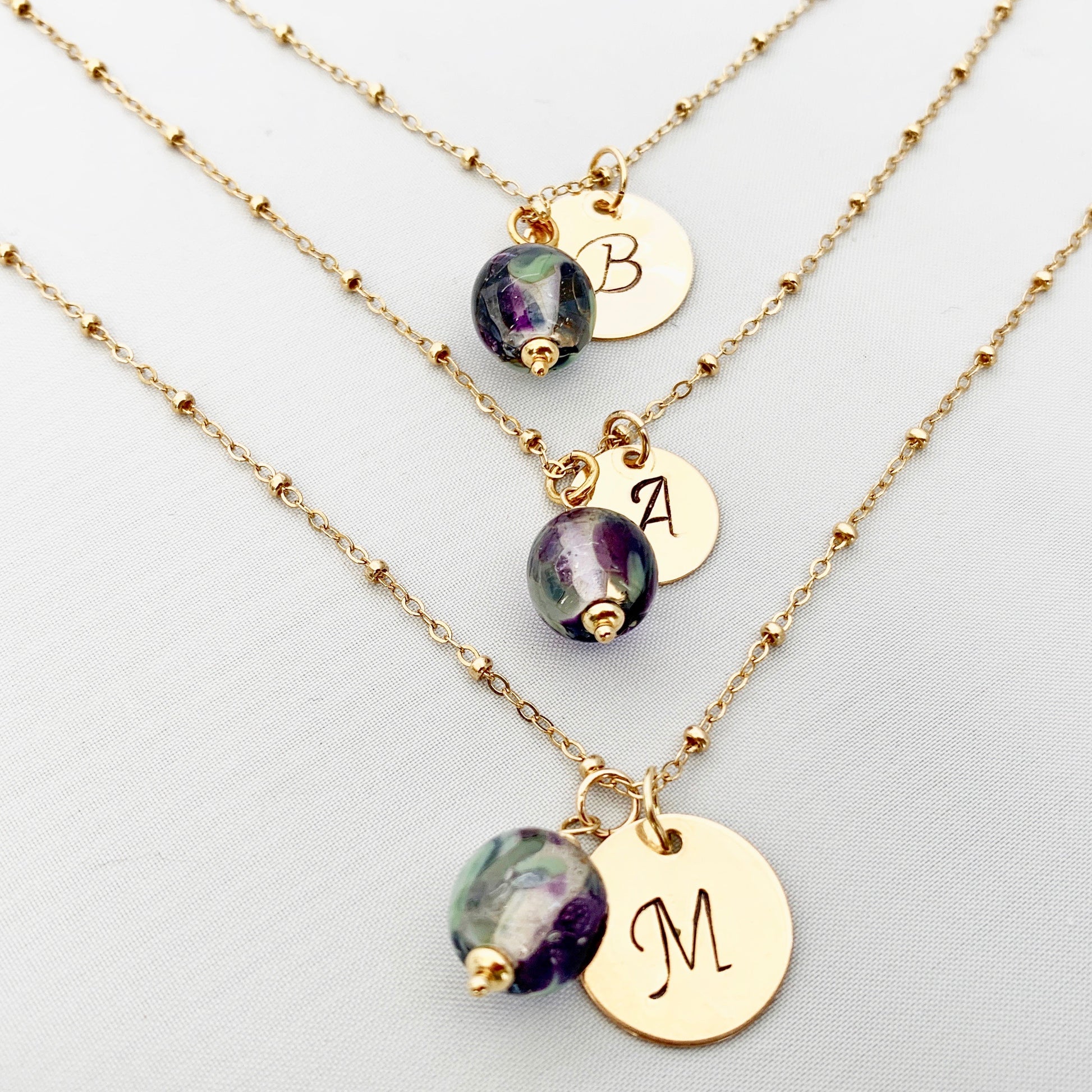 14K gold-filled custom stamped discs, with a handcrafted glass bead. Glass bead colors can be customized; please indicate preferred color and bridesmaid initials at checkout.