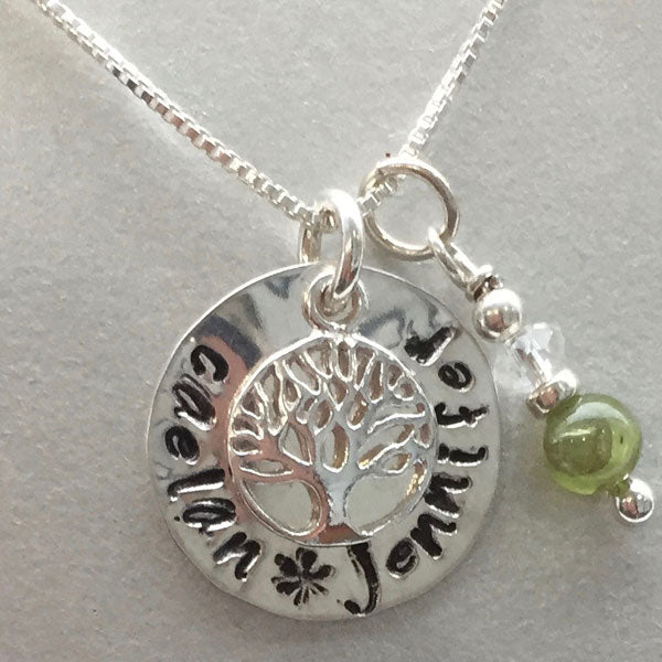 Sterling silver-Delicate glass bead with Swarovski or gemstone drop and sterling silver “tree of life” charm. On a 16” or 18” sterling ball chain. Customize with kids or grandchildren names. One of our most popular gifts!