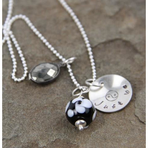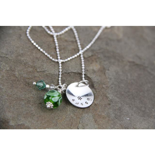 Sterling silver necklace stamped with word or saying of your choice. Handcrafted artisan glass bead. Customize completely-choose your bead color, stamped saying and sterling charm! Choose from 16", 18" or 20" sterling ball chain.