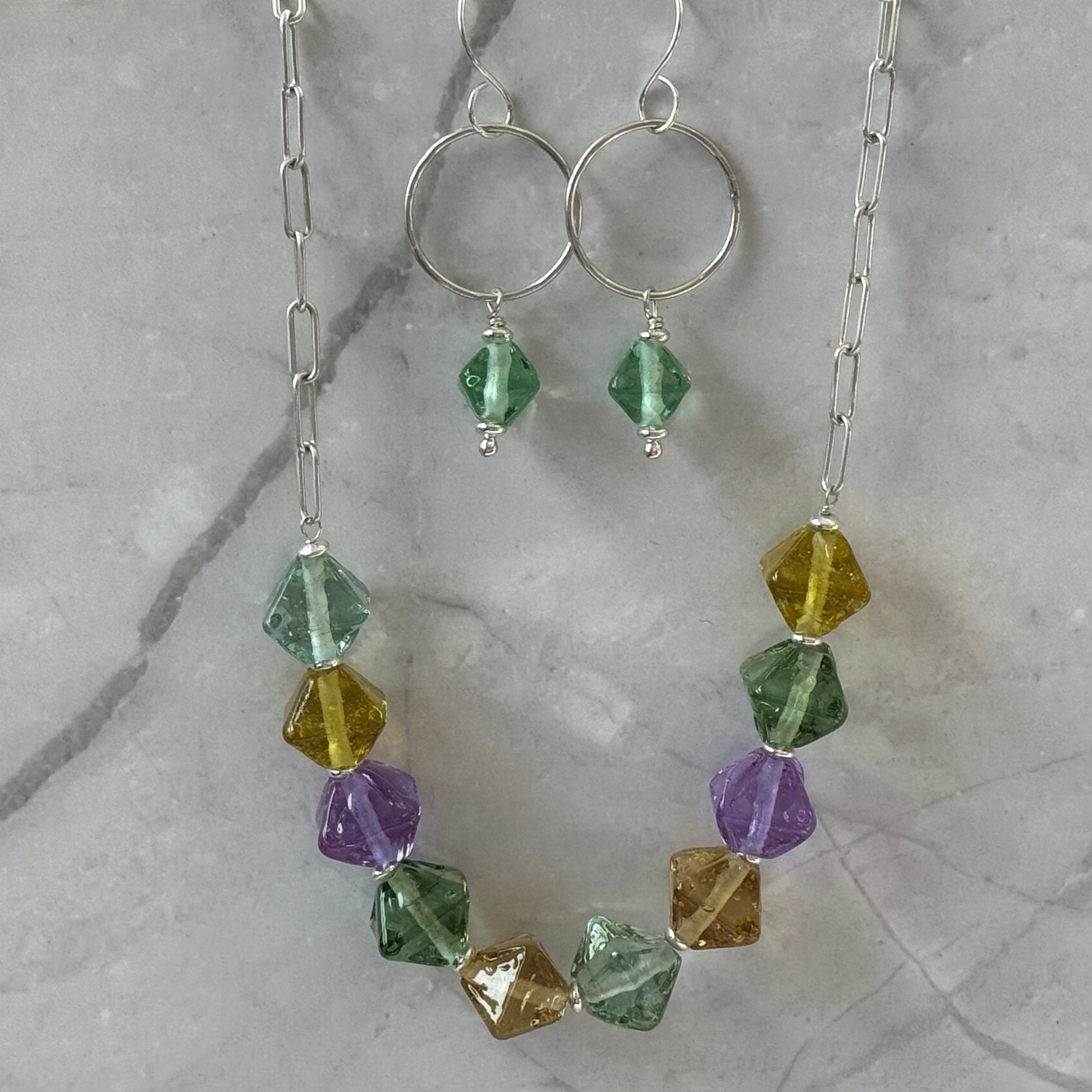 Introducing our latest collection, Fire and Ice. Sterling silver necklaces and coordinating earrings, reminiscent of cool ice cubes, forged in fire on the torch. Airy, lightweight handcrafted glass beads hang from metal-smithed sterling rings, each delicately hammered and forged to create a shimmering diamond-cut effect. Bold, yet simple. Limited edition.