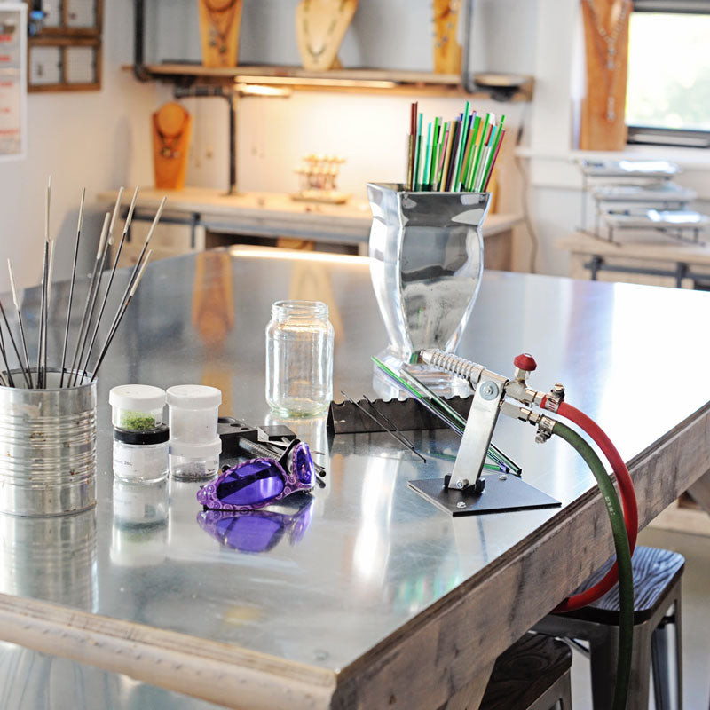- Guided torch rental (for advanced beginner to intermediate levels): $26/hour (This is not for beginners - If you are completely new to glass beadmaking, please take one of our Intro/101 classes first)